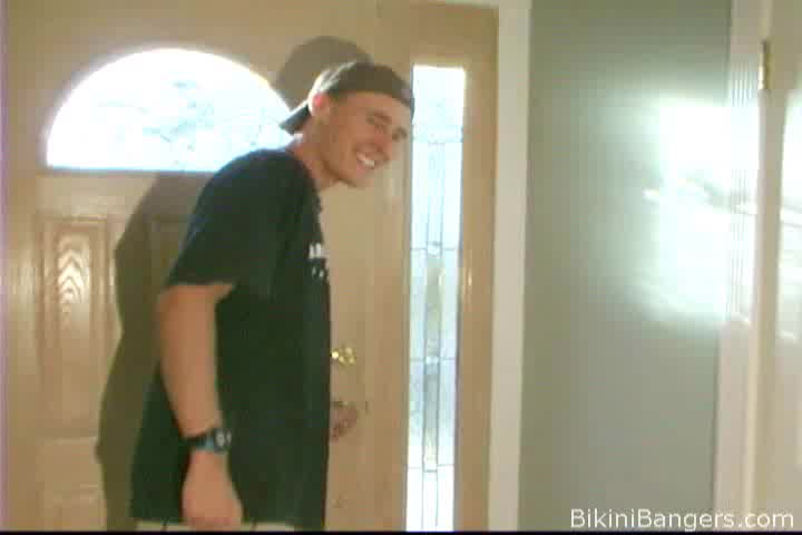 The hottest tattooed brunette in blue bikinis reveals a pierced pussy
