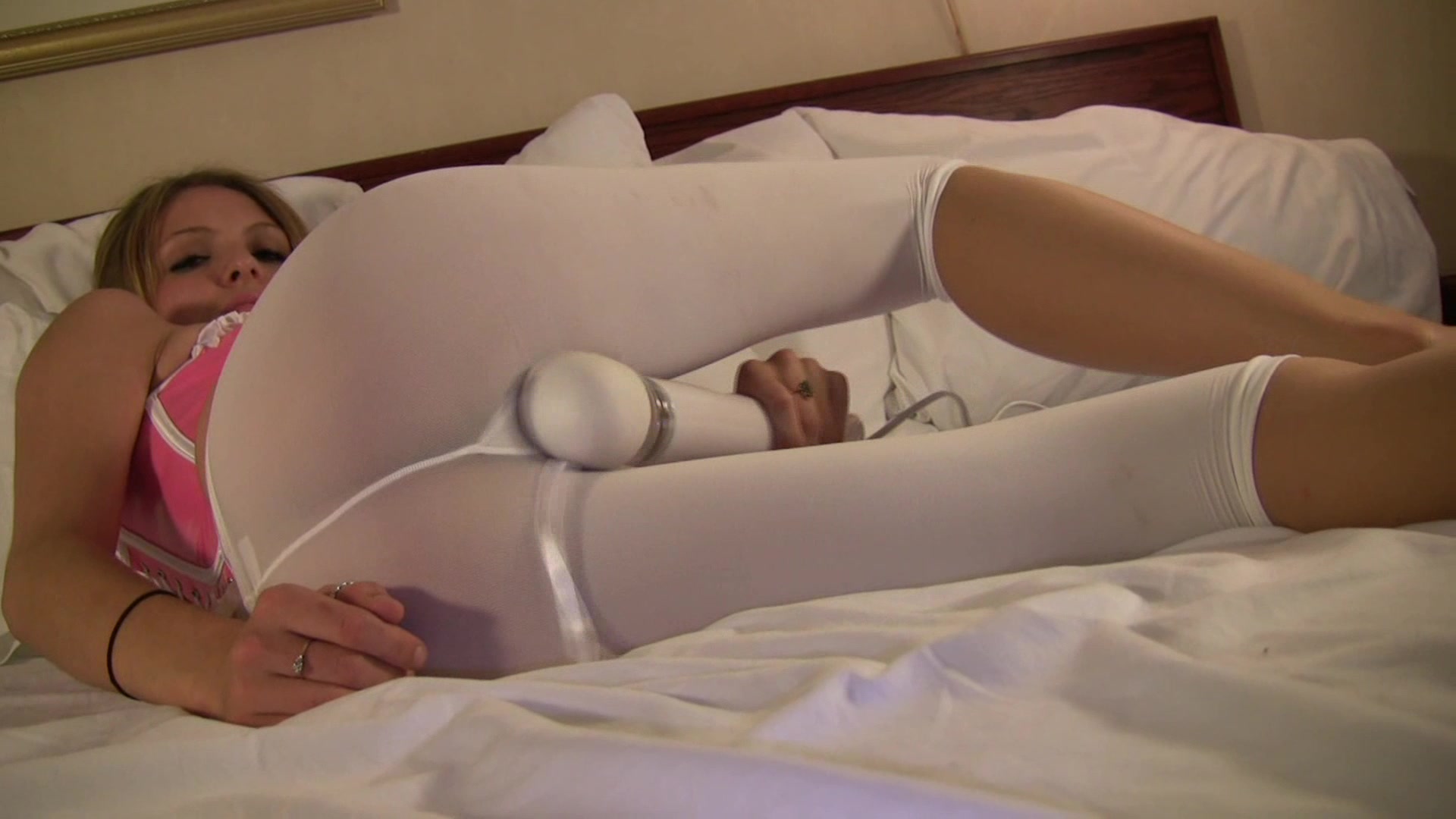 Awesome young babe in white pantyhose plays with a big vibrator