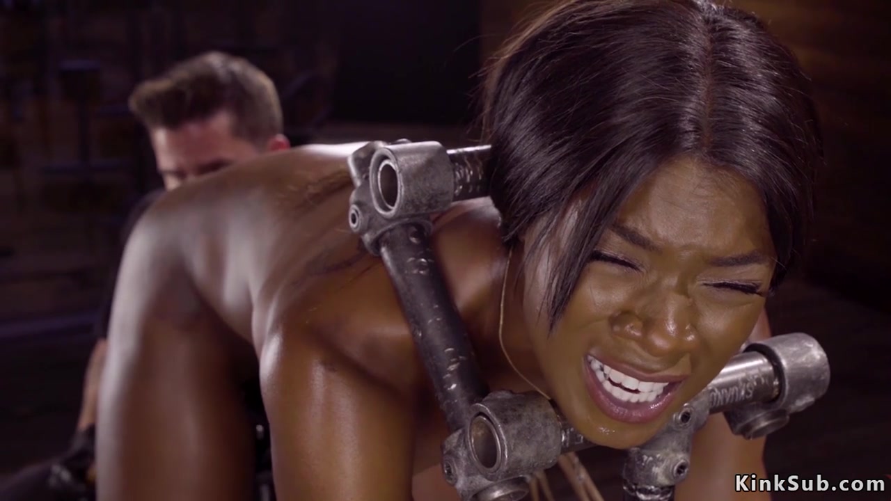 Bent over ebony in steel locks is toyed