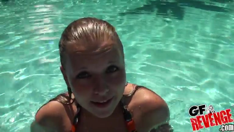Bikini cutie Jessica Stone is sucking a shaft on the poolside