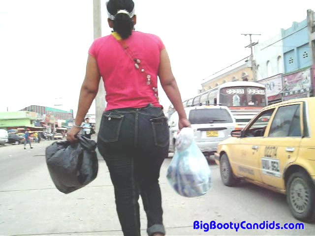 Brunette in pink t-shirt have a round big booty and tight jeans
