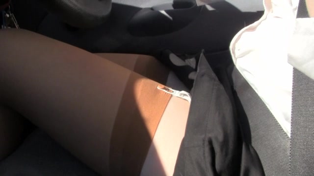 Good pigtailed MILF in stockings drives a car and flashes her panties