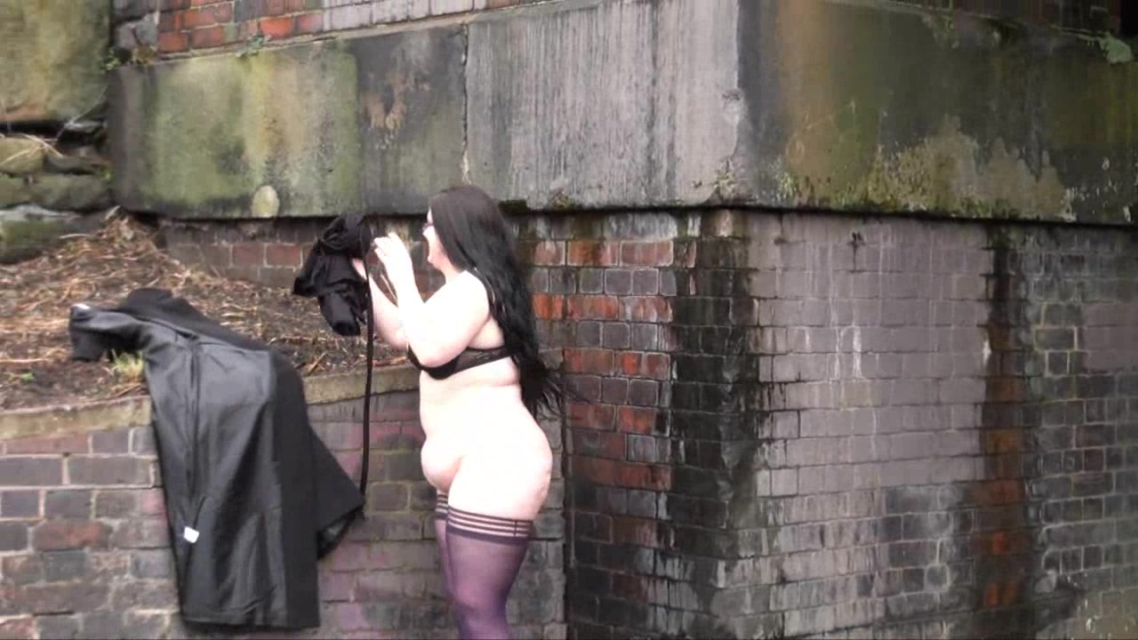 Shameless big-boobed UK Flashers blonde strokes her snatch in public place