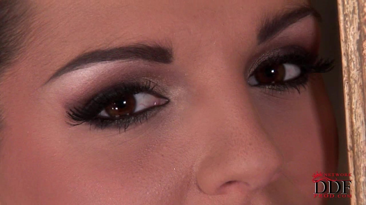 Sensual big-butt brunette Eve Angel stretch her accurate shaved snatch