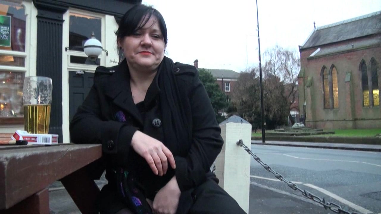 Fatty British mature reveals her naked puss in the public place