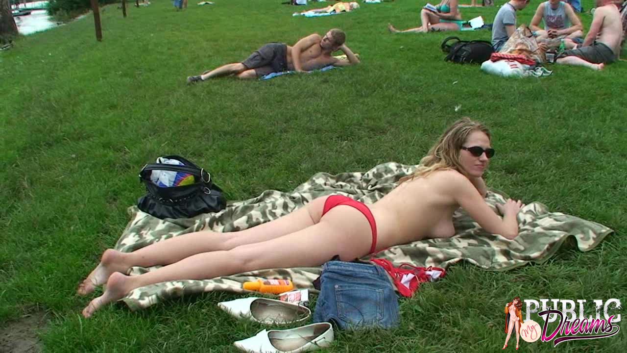 Hot cutie slowly undresses on the grass and asks a stranger to apply tan cream