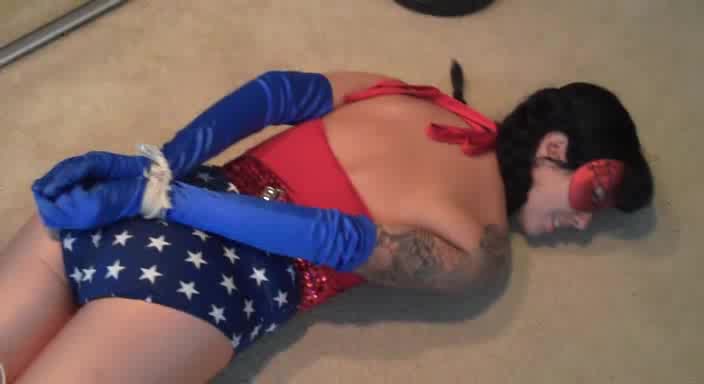 Bonded and masked babe is lying in purple spandex tights