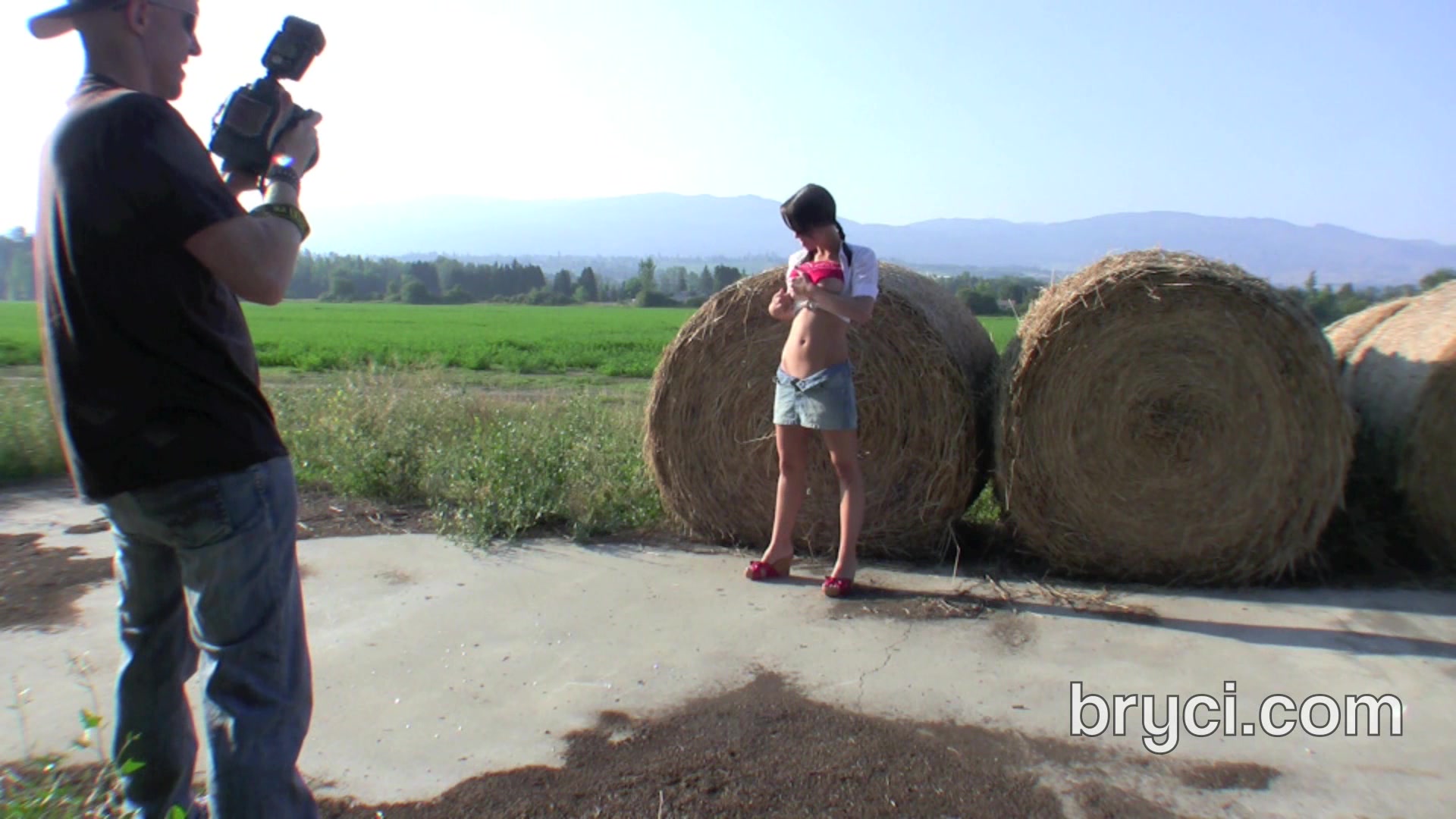 Outdoor nude photo shoot at the hayloft with a hot amateur brunette