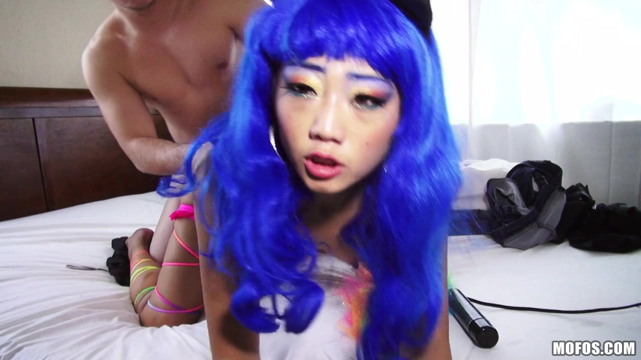 Pervs On Patrol interracial sex in the bed with a blue-haired Asian Miko Dai
