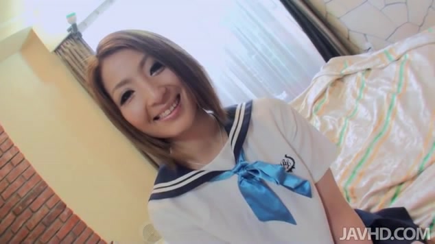 Smiling Japanese schoolgirl is having great sex in bedroom