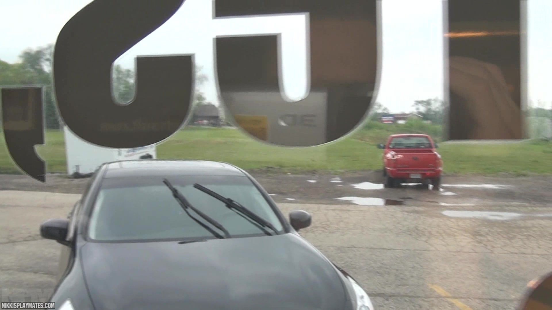 Wet beauty Nikki Sims pours some water on her white t-shirt