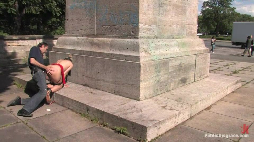 Pink-haired Bella Beretta performs a head in Public Disgrace style