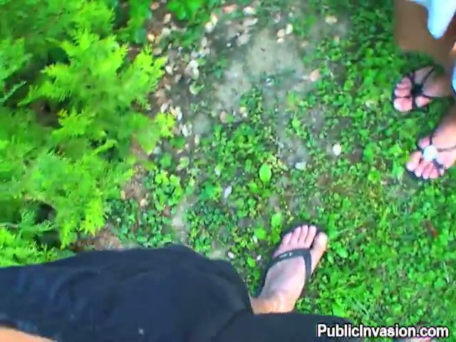 Gorgeous brunette in outdoor porn spreads her legs and revels a shaved cunt
