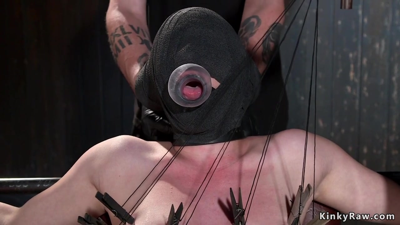 Brunette slave is set on wooden horse
