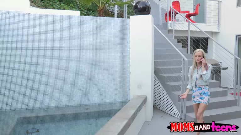 Slender blonde with big tits is blowing teen's boyfriend dick