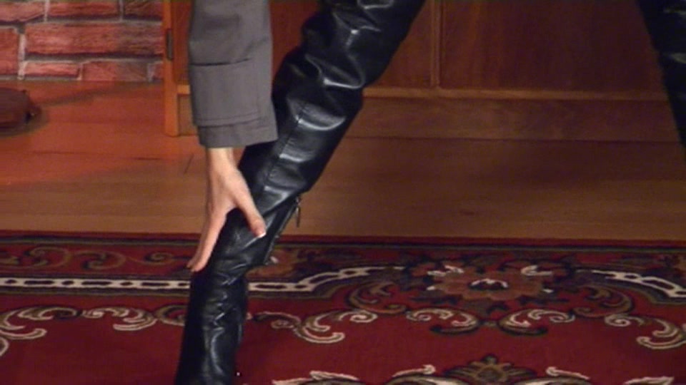 Smiling hottie in leather boots shows off her gorgeous boobs