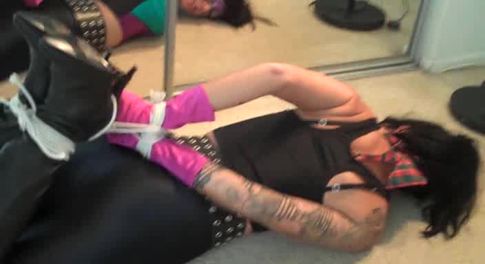 Sexiest bitch in black spandex tights is lying while being bonded