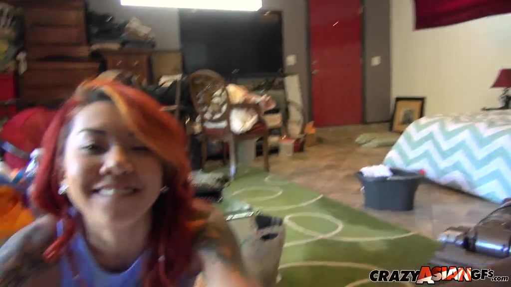 Tattooed redhead Asian Kimberly Chi stimulates her snatch