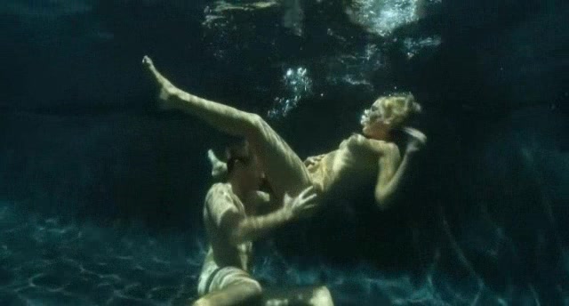 Sweet underwater dance of a leggy mademoiselle in blue dress