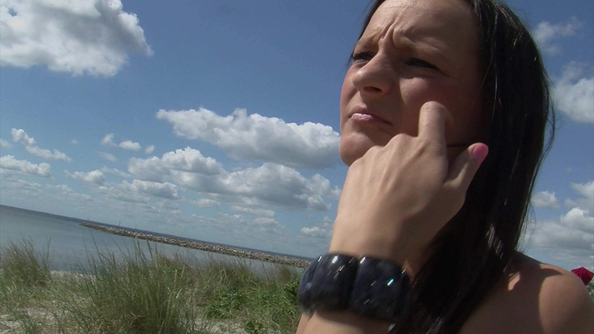 Unge Danske films how a brunette drills her cunt on the beach